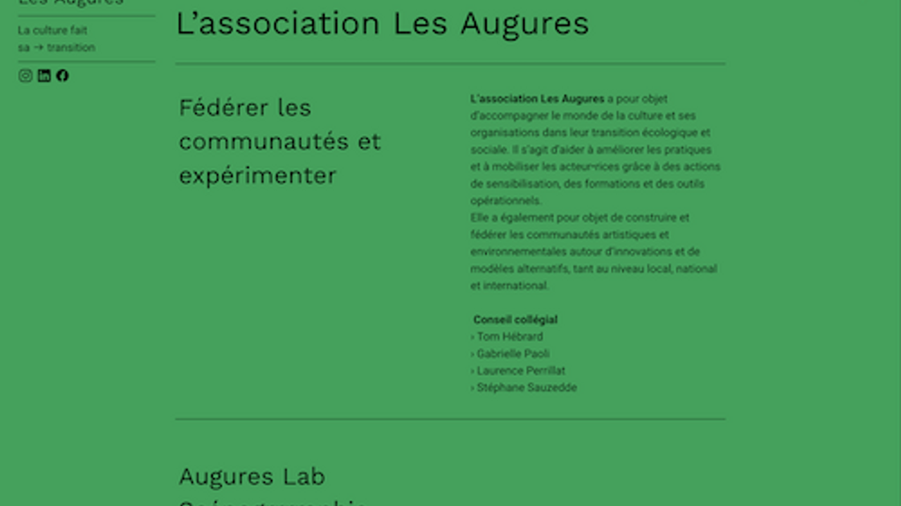 "L'association Les Augures a pour objet d'accompagner le monde de la culture et ses organisations dans leur transition écologique et sociale. Il s'agit d'aider à améliorer les pratiques et à mobiliser les acteur•rices grâce à des actions de sensibilisation, des formations et des outils opérationnels. Elle a également pour objet de construire et fédérer les communautés artistiques et environnementales autour d'innovations et de modèles alternatifs, tant au niveau local, national et international."
